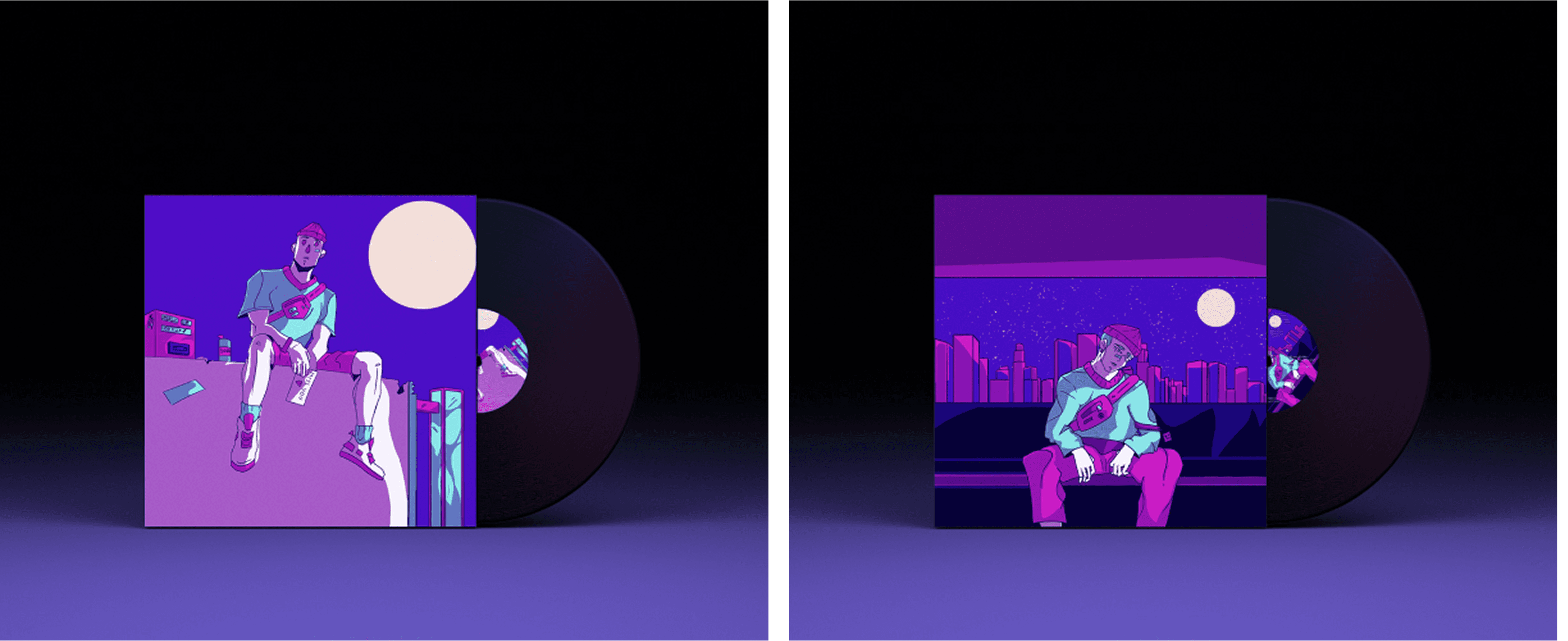 Okawa et Maxime Lemonnier sont deux artistes talentueux aux univers musicaux variés. Pour leur nouveau projet, ils ont choisi d’explorer un style mélancolique et apaisant : la Lofi Hip-Hop. Okawa m’a confié la création graphique de deux vinyles, dans un style mêlant manga et streetwear, avec une atmosphère à la fois sombre et romantique.