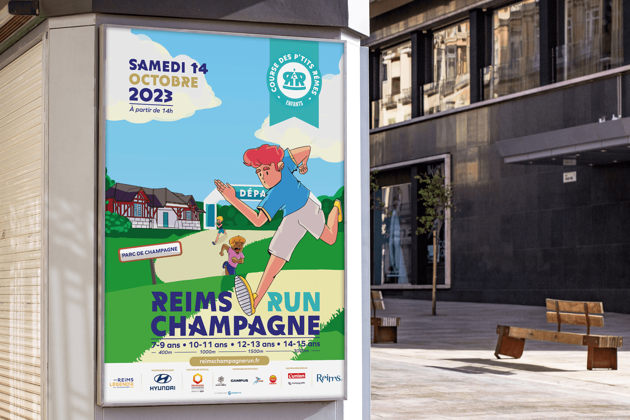 Playground event a gagné en 2023 l’appel à projet pour la course d’endurance «Reims champagne run». Étant une entreprise d’évenement sportif, elle a dû s’occuper de l’intégralité de la communication et du graphisme de la course. Étant en charge de ce projet, j’ai pu m’occuper plus particulièrement de l’affiche de la course enfant se déroulant dans le parc de champagne à Reims. J’ai pu appliquer mon style graphique pour la course en adaptant la colorimétrie de l’identité graphique. L’affiche a ensuite été adaptée aux réseaux sociaux.