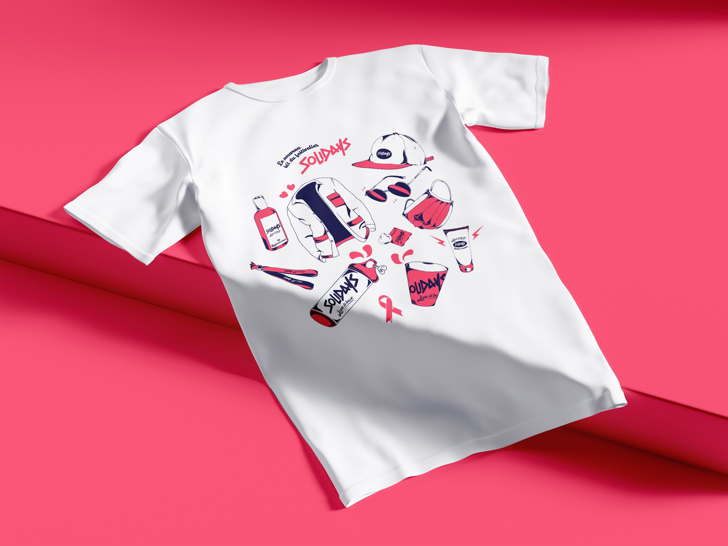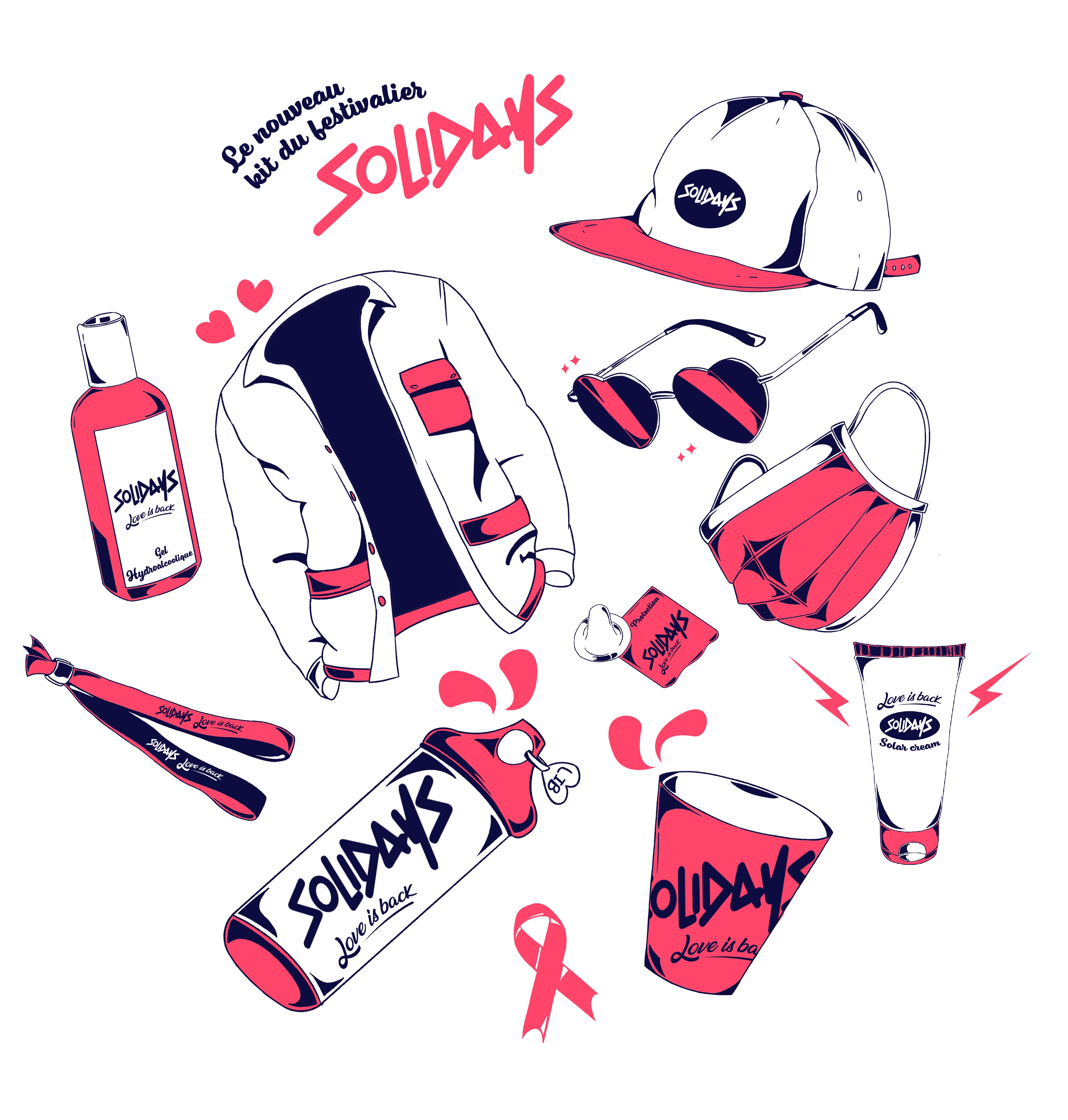 Solidays est un festival de musique organisé par l’association Solidarité Sida. Depuis 1991, il réunit, sur les pelouses de l’hippodrome de Longchamp à Paris, des artistes, conférenciers, militants et festivaliers autour de thématiques telles que les droits humains, la santé sexuelle, l’environnement et l’engagement de la jeunesse. Pour l’édition 2022, un concours a été lancé pour concevoir le merchandising du festival. J’ai choisi de créer un kit du festivalier, intégrant les nouvelles priorités liées au contexte sanitaire, tout en conservant l’esprit festif et engagé de l’événement.